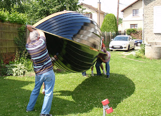Un grand moment... Le plus dur a été de sortir l'ensemble support + bateau hors de la cabane, car les bastings pèsent leur poids. Le retournement lui-même est un jeu d'enfant : le bateau est plus léger que je ne l'aurais cru, on le soulève et le retourne sans problème à trois.